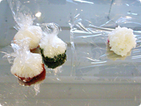 ラップを巾着のように丸めて形を整える。ラップを外して皿に並べる。・えびやたこなどそのほかの魚介の刺身はもちろん、梅干しやたくあんも具材におすすめ。