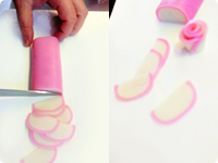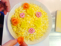 トッピングの準備をする。1~2mm程度に薄くスライスしたかまぼこを縦に3枚並べてくるくる巻き、花の形にする。同様に、スモークサーモンも一切れずつバラの花をイメージしてくるくる巻く。たくあんは1.5cm角に切り、格子状の切り込みを表面に入れてたんぽぽの花のように全体を開く。かいわれ菜は葉の部分を含めた上の方を切ってつかう。