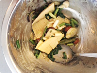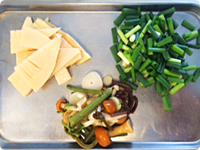 山菜とたけのこの水をきり、たけのこは薄いくし切りにする。万能ねぎは2cmほどに切る。