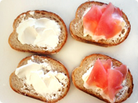 スライスしたカンパーニュにクリームチーズを塗り、②と生ハムをのせ、オリーブオイルをふりかける。・水煮の山菜やたけのこを使えば、いつでも手軽につくることができます。
