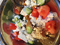 きゅうり、トマトを小さめの乱切りにし、ボウルに①とザーサイを入れ、塩を加えて豆腐をほぐしながら混ぜる。