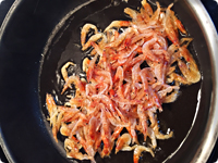 強火で熱したフライパンにごま油をひき、桜えびをサッと炒めて、②のボウルに入れる。良く混ぜ合わせたのち、わさび菜を敷いた器に盛りつける。・ごま油を熱することで、香ばしい風味が全体を包み込みます。
