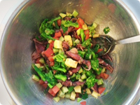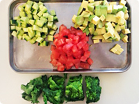 きゅうり、トマト、アボカドを1cm程度の角切りにする。 菜の花は下茹でしたのち冷水で冷やし、2cm程度に切る。