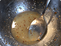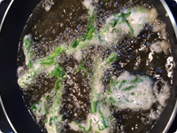 菜の花をAの衣をつけて180℃に熱した油で10秒程度揚げる。よく油をきって皿に盛り、Bをかける。・衣にビールを使うことで、ビールに含まれる炭酸が油をはじいて、サクッと揚がります。
