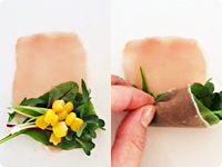 生ハムを1枚ずつ広げ、それぞれにベビーリーフ、根元を切ったかいわれ菜、コーンをのせて端からくるくると円錐状になるように巻いていく。・生ハムを巻く際、海苔巻きのように並行に巻くのではなくブーケをイメージして円錐状に巻くのがポイント。
