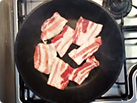 熱したフライパンに塩とこしょうを振った豚ばら肉を入れ、強火で焼き目がつくまでさっと焼く。