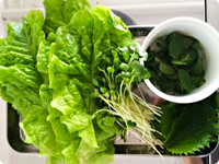 サニーレタス、大葉、根元を切ったかいわれ菜、①と②を皿に盛り、レモンを添える。サニーレタスで肉と野菜、①を巻いていただく。・豚ばら肉は焼きすぎないよう注意を。焦げ目を付けないようにさっと焼いて、ジューシーな食感を楽しんでください。