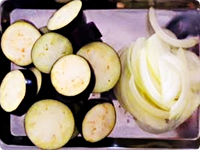 なすは皮つきのまま1cm幅の輪切りに、たまねぎは皮をむいて5mm幅の薄切りにする。