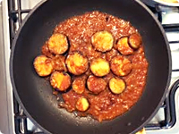 フライパンにオリーブオイルを熱し、②を強火で炒める。なすに焼き目がついたらミートソースを入れ、弱火で5分ほど煮込む。