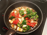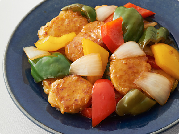 ②のフライパンにごま油大さじ1をひき、ピーマン、パプリカ、たまねぎを中火で2分ほど炒める。Bを加えて1~2分加熱し野菜に火が通ったら②を加える。ひと煮立ちさせたらCを加えて混ぜ合わせる。とろみがついたら皿に盛る。・黒酢の代わりにケチャップと穀物酢を使えば酢豚風に変身。お子さまも満足間違いなしの食べ応えある味わいに。