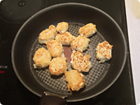 ①をスプーンですくって一口大の平たい餅状に伸ばす。熱したフライパンにごま油大さじ1をひき、それぞれ両面を中火で2分ずつくらいこんがりと焼いて取り出しておく。