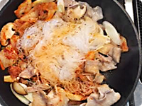 フライパンにごま油を熱し、豚バラ肉、長ねぎ、しいたけを炒める。火が通ったらキムチ、春雨、しょうゆ、水を加え、強火にし、水分が無くなるまで炒める。・豚肉、しいたけなどのうまみを染み込ませるために、水分を飛ばすように炒めるのがポイント。