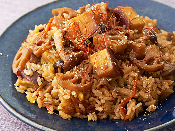 ほっくりとした旬のさつまいもを、甘辛いきんぴらにして炊き込んだご飯です。ピリッと効いた唐辛子が、食欲をさらに刺激。秋らしさ満点のレシピです。行楽のお供にもどうぞ。