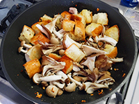 フライパンに、にんにく、オリーブオイル、バターを入れて弱火で火にかけ、香りが出たら中火でバケットを入れて2~3分こんがりと焼く。きのこを加えて炒め、塩こしょうで味付けをする。・トマトやナスなどの野菜をたっぷり加えてパングラタンにしても◎。
