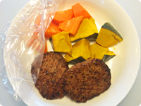 かぼちゃ、にんじんは乱切りにし、ハンバーグ(火の通ったもの)と一緒に電子レンジ600Wで4~5分加熱する。