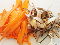 ・具材をピーラーで薄くひも状にするため、短い揚げ時間で仕上がります。 ・うどんやそばのトッピングにしても◎。