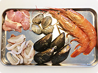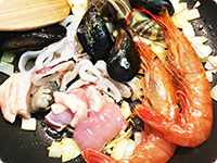 フライパンにオリーブオイルを熱し、にんにく、玉ねぎを炒める。玉ねぎが透きとおってきたらあさり、ムール貝、エビ、イカ、鶏肉を加えてさらに炒め、白ワインを加えてさっと煮込み、塩、こしょうをする。