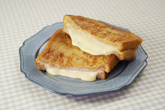 食パン(1枚)にハム(1枚)をのせ、スライスチーズ(2枚)をのせる。ハム(1枚)をのせ、食パン(1枚)をのせてはさむ。同様に計2個作る。