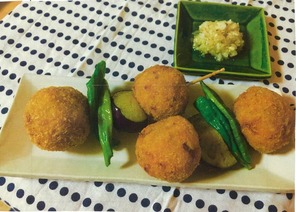一口で様々な食感を味わえるように、つくねに合う京野菜を混ぜ込みました。一度に黒コショウ・ねぎ塩・レモンの三種…