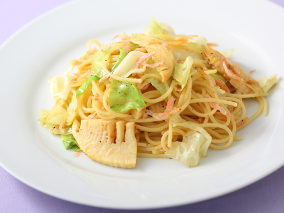 旬の筍や春キャベツの野菜の風味を生かすため、ベースのパスタは、ペペロンチーノでさっぱりと仕上げ、桜海老でうまみをアップ。隠し味にアンチョビを加えることで味が引き締まり、ワインにも合いやすくなります。