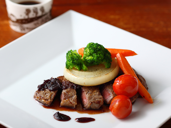 父の日にもぴったり! 大人向けの牛フィレステーキ登場。みりんと醤油に赤ワインを合わせ、たっぷりの玉ねぎと煮込んだ特製ソースでいただきます。お肉がジューシーなので、野菜を添えてバランスを整えるのがポイント。