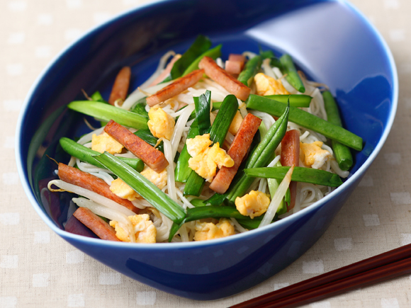 暑い夏にも、スルスルといただける素麺チャンプルー。スパムに塩気があるので、野菜と卵は薄味で、塩・コショウとごま油を使って香ばしく仕上げました。