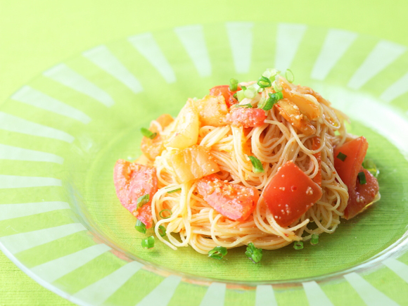 キムチの個性を柔らかく引き出すために粉チーズをプラスするのがポイント。ゴマ油とオリーブオイルを絡めて香り豊かに仕上げ、トマトやキムチの酸味でさわやかな後味に。残暑にぴったりの冷製パスタです。