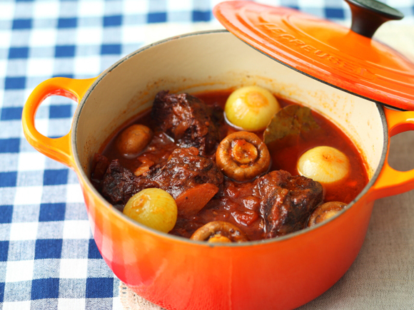 赤ワインとトマトの水煮だけで、牛肉をコトコト煮込みます。コクをアップさせるために、細切りのベーコンを加えるのがポイント。黒コショウもしっかりきかせているので、赤ワインによく合います。