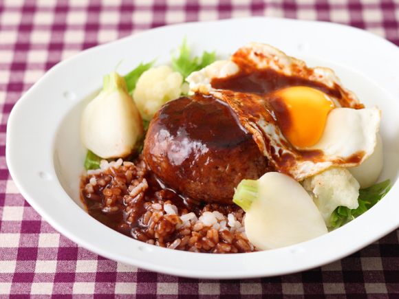 器にご飯をのせ2のハンバーグ、5の目玉焼きをのせる。周りに6の野菜を添え、4のソースをたっぷりかける。