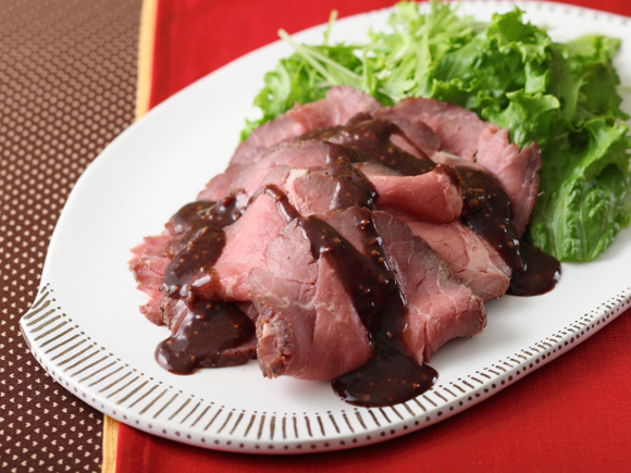 食卓が華やぐ、おもてなしにもぴったりの簡単ローストビーフ。お肉にはコショウをしっかりきかせて焼くのがポイント。特製ソースは赤ワインを煮詰め、醤油とコンソメ、粒マスタード、小麦粉で仕上げるだけの簡単レシピです。