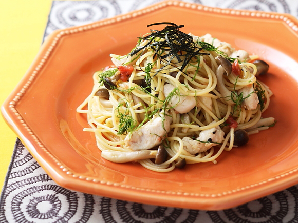 梅肉としそのさっぱり感と、ニンニクとバター醤油のコクが一度に楽しめるワインに合うパスタ。バターでソテーして香り豊かなしめじと、白ワインで蒸してふっくら仕上げたささみの食感がポイントです。
