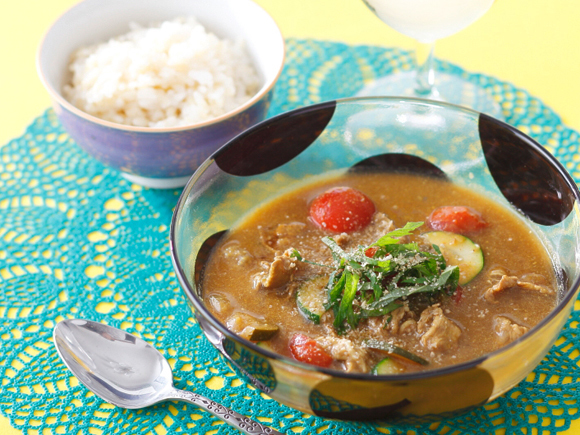 さらっとマイルドな、暑い日にもおいしい冷汁。カレールーは少なめにして醤油を隠し味に、お肉と野菜は白ワインで軽く蒸しておくのがポイント。すりごまを入れて、香りと口当たりを豊かに仕上げました。