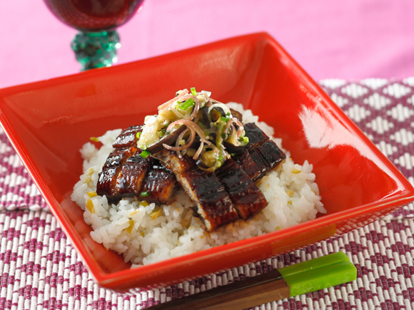 うなぎとバルサミコの抜群の相性を堪能できるレシピ。赤ワイン、バルサミコ酢、醤油を同量ずつ加え煮詰め、タレつきのうなぎを加えるだけ。ごはんにオリーブをまぶすことで味のメリハリがつき、ワインがすすみます。