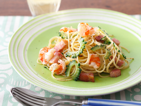 ゴーヤの苦味と風味豊かなエビやベーコンのうまみを楽しめるペペロンチーノ。ゴーヤは薄切りして塩もみしておくと苦味がやわらぎます。厚切りのベーコン、白ワインで蒸したエビを加えれば、風味、食感もアップ。