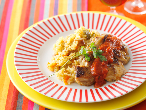 炊飯器でできる簡単ジャンバラヤ。野菜、お肉を焼き、カレー粉を加えたお米と炊飯器で炊くだけ。うまみや味わいを閉じ込め、かつお肉もふっくら仕上がります。トマトソースにチリペッパーを加えたソースを添えて。