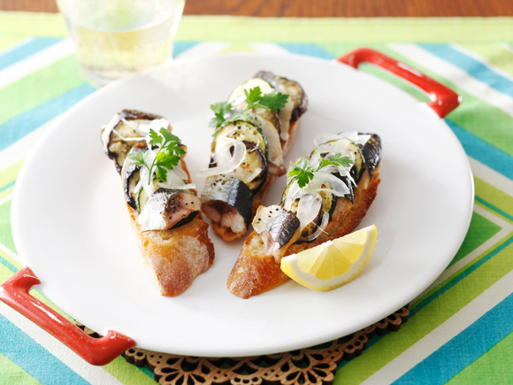 ニンニクバターを塗った薄切りのバゲットに、脂ののった生の秋刀魚、炒めた季節の野菜をのせて、トースターで焼き上げるだけのお手軽タルティーヌ。秋刀魚のうまみがパンにしみ込み、たまらないおいしさです。
