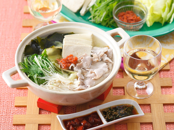 白ワイン、昆布の入った深みのある出し汁に、水菜、わかめなどのさっぱり食材を、梅干と一緒にいただく豚しゃぶ。味噌ベースのちょっと甘いたれと、めんつゆベースのたれの2種をご用意。梅干を混ぜながらどうぞ。