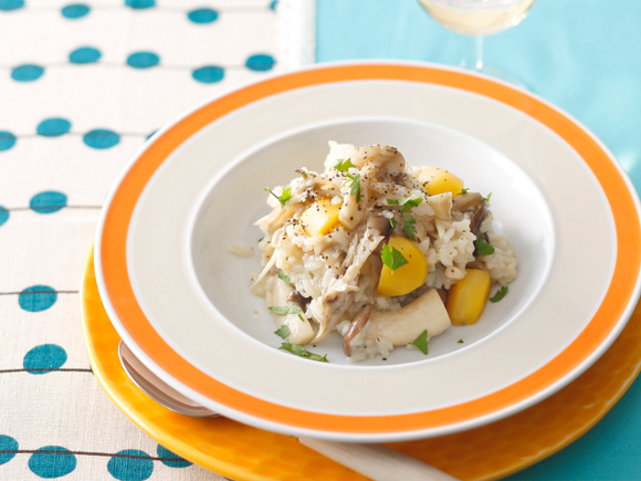 冷えたごはんでできる簡単リゾット。しめじ、エリンギ、舞茸の3種を炒めて風味を出し、ごはんに粉チーズ、白ワイン、ブイヨンを加えて味をととのえるだけ。お好みで最後に栗を添えて、季節感を出すのもおすすめ。