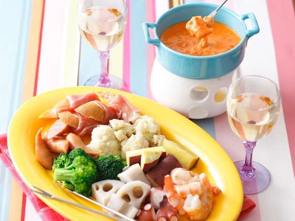 とろけるチーズ、白ワイン、ホールトマトだけでできる簡単フォンデュ。コクと酸味の絶妙なバランスが楽しめます。トマトの酸味のおかげで、飽きのこない味わいです。具材は、野菜、肉、魚介などお好みでどうぞ。