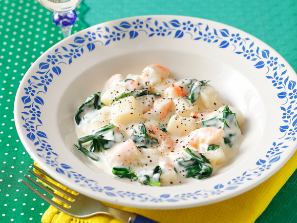 水(分量外500~600ml)に白ワインを加え沸騰させ、おもちを入れ、2分程したら海老、ほうれん草を加えさらに1~2分、おもちに火が通ったら、すべての材料を引き上げ、水気をきる。