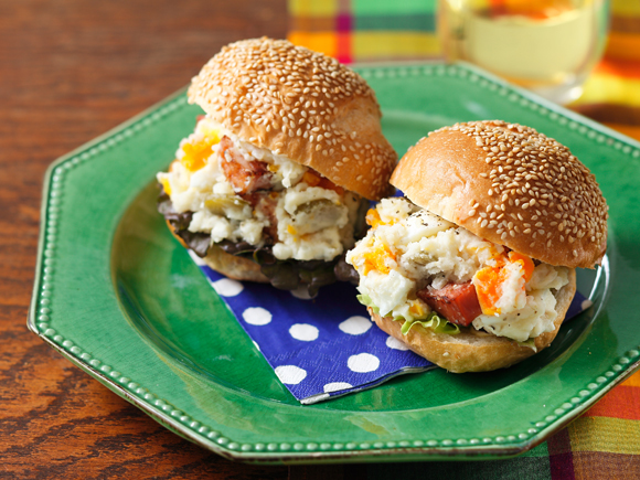 じゃがいもと玉ねぎをコンソメでゆでて下味をつけ、マヨネーズにサワークリーム、ピクルスも加えて酸味をアップしています。半熟卵、厚切りベーコンなどは大ぶりサイズにし、男性も満足のボリューム感に仕上げました。