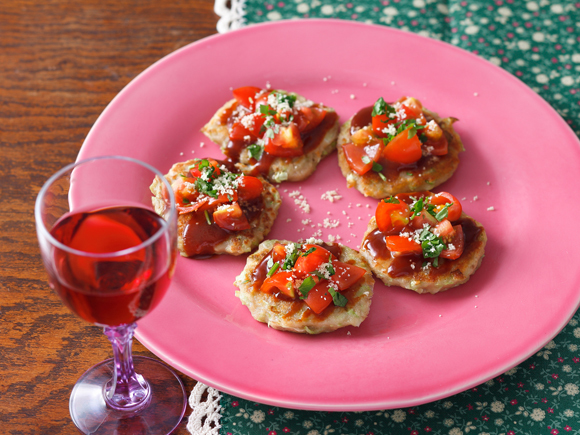 生地の中に、ひき肉、粉チーズ、キャベツをいれて味わいを豊かにし、とんかつソース、トマトケチャップ、お酢を加えたソースをたっぷりつけてどうぞ。お好み焼き粉をつかえば失敗知らずでふんわりと仕上がります。