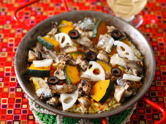 かぼちゃ、きのこ類、レンコンなどの野菜、オイルサーディンと細切りベーコンを加えてコクをアップ。白ワインとコンソメ、サフラン、きのこの香りを楽しみつつ、秋の食材がたっぷり食べられるパエリアです。