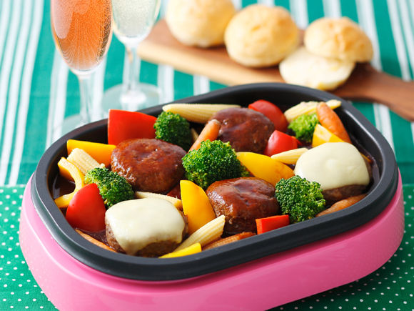 赤ワイン、ケチャップ、中濃ソースを混ぜて2に流し入れ、3、ベビーコーンを加え、ハンバーグにスライスチーズをのせ蓋をして、チーズが溶けたら蓋を取りバンズを添える。