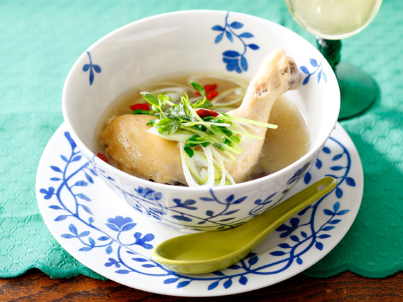 鶏もも肉にもち米、むき栗、ショウガを詰めて、楊枝でとめ、水、ショウガに白ワインを加えコトコト煮て、最後にお塩で味を整えるだけ。仕上げに切ったネギをかけていただきます。