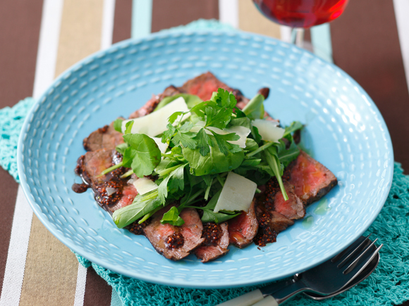バレンタインに振る舞いたい、男子が大好きな牛肉のタリアータ。かたまり肉の表面を強めに焼き、赤ワインを入れて蒸し焼きにし、薄くスライスして、バルサミコ酢、赤ワイン、粒マスタードのソースをかければ出来上がり。