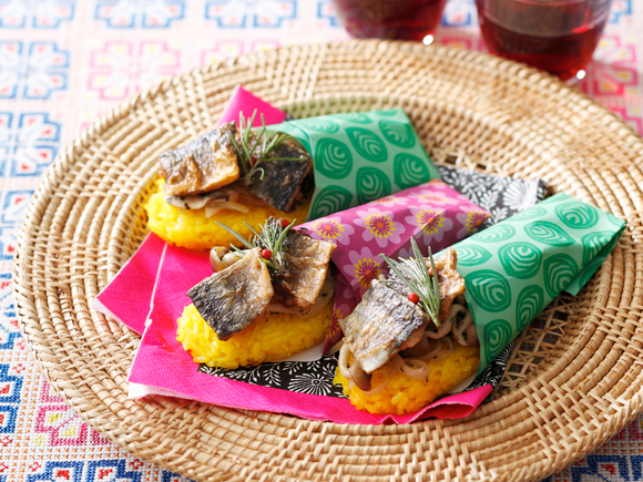 ターメリックライスを小判形にし、焼きおにぎりの要領でタルティーヌ台を作ります。小麦粉をふるった秋刀魚にバルサミコとミックスハーブで味付けし炒めたキノコ類をライスにのせてできあがり!秋空のもとで食べたい一品です。