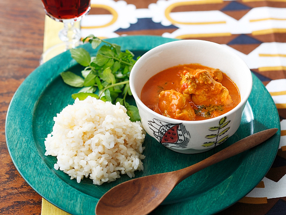 ヨーグルトに漬け込んだ鶏もも肉、カレー粉、パプリカパウダー、バター、生クリーム、ホールトマト缶を入れて煮込み、最後に醤油とトマトケチャップでコクを出し、バジルペーストで香りを豊かにしたまろやかコクカレー。