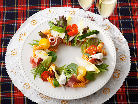 トマトソースで味付けしたパスタをリース型にし、お好みの具材を自由に盛り付けます♪パーティには伸びにくいショートパスタを使うのが便利!普段のパスタも盛り付けを工夫するだけで、華やかなパーティ料理に変身します!
