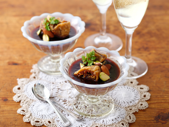 バレンタインにぴったりの大人デザート。チョコレート、牛乳、生クリーム、卵黄、砂糖、ゼラチンでチョコプリンを作り、赤ワインとラズベリージャムを合わせたソースを上からかけ、ドライいちじく、ピスタチオ、アーモンドを添えます。